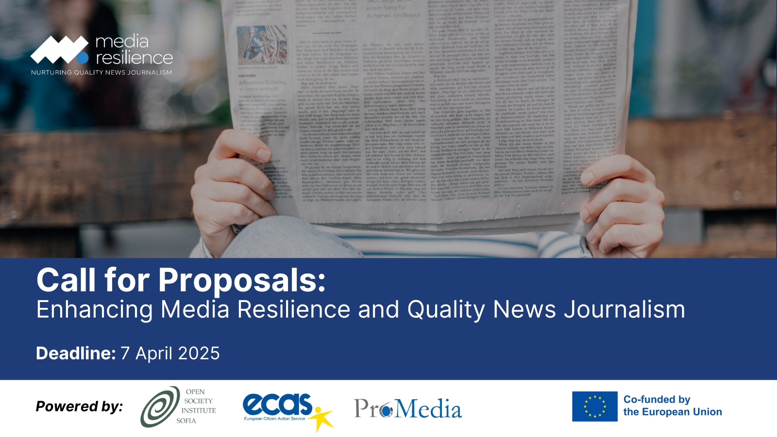 This call for proposal is announced under the project Media Resilience: Nurturing Quality News Journalism. The goal of the project is to strengthen a free, diverse, and pluralistic news media landscape and promote quality journalism, with an emphasis on enhancing quality media outreach to the most vulnerable groups in society susceptible to disinformation. The Project, led by the Open Society Institute – Sofia and implemented in cooperation with the European Citizen Action Service and ProMedia, is co-financed by the European Union through the European Education and Culture Executive Agency (EACEA) under the Creative Europe (CREA) programme (Grant Number 101180135).